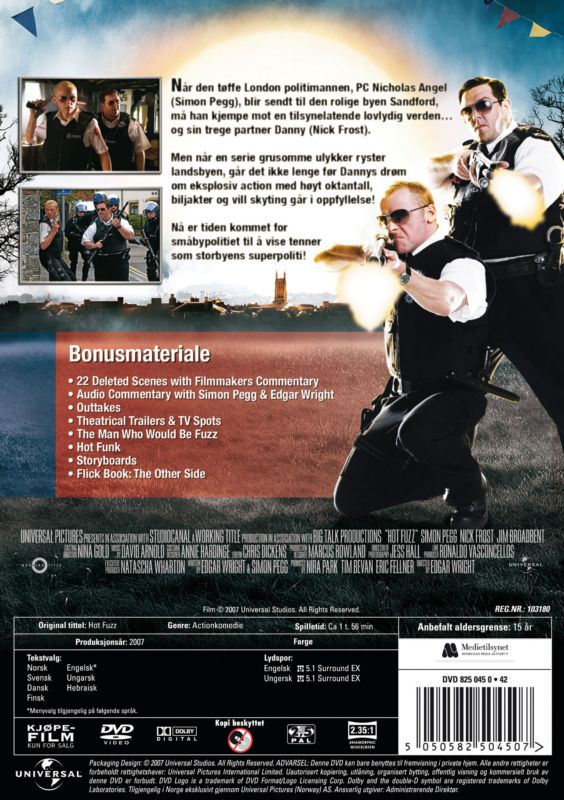 | Nick Angel (Simon Pegg) is one of the best cops in London. In fact, he is too good, and to improve the morale of his less capable colleagues, Nick is promoted but transferred to the idyllic village of Sandford. At first, things look intolerable for the new cop from the city, as his world of drug busts and apprehension of murderers is replaced by nabbing underage drinkers and chasing down missing swans. When Nick is not staking out the swan, he dutifully answers the questions about being a big city police officer from his young partner Danny Butterman (Nick Frost), and resists dessert offers from Danny's father, Chief Inspector Kenneth (Bill Nighy). Sandford looks like a crime free paradise until a string of accidental deaths occur. Nick's big city cop instincts kick in as he starts to suspect foul play. However, the major presences in Sandford like the Inspector or retail magnate Met Sergeant (Martin Freeman) refuse to believe Nick. Slowly, as Nick continues his chase, the big city cop-like-you-see-on-TV dreams of Danny start to become real, the stuff of Danny's DVD collection becomes the stuff of his life. |