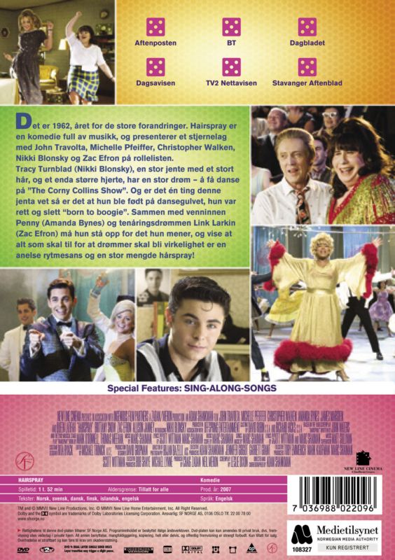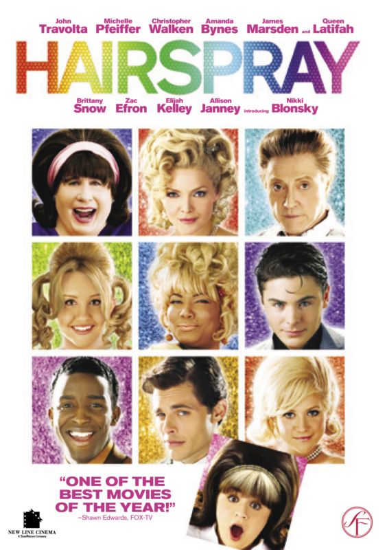 | Hairspray (2007) focuses on 1960s Baltimore teen, Tracy Turnblad, and her quest to make the cast of a local television dance program 'The Corny Collins Show'. After hearing a message from the show's star, Link Larkin (Zac Efron), Tracy decides to go to the auditions, with the ultimate goal of winning Link as her boyfriend. Tracy's parents Edna (John Travolta) and Wilbur (Christopher Walken) are divided over whether their daughter should face the hash criticism that comes from being on television. At the television station, manager Velma von Tussle (Michelle Pfeiffer) rejects Tracy's application due to her positive views on racial integration, and Tracy is then sent to detention for cutting class to audition. A series of events involving a black boy teaching Tracy a dance abd Link seeing her dance in detention lead Tracy to a spot on The Corny Collins Show, along with assorted fame in Baltimore. Tracy then participates in a anti-segregation march and winds up on the run from the law, while at the same time, Link is declaring his love for her, regardless of what his manager Velma thinks about Tracy and her views. The film culminates with the Teenage Hairspray pageant on television, with Tracy competing against Link's old girlfriend Amber, among other girls. |