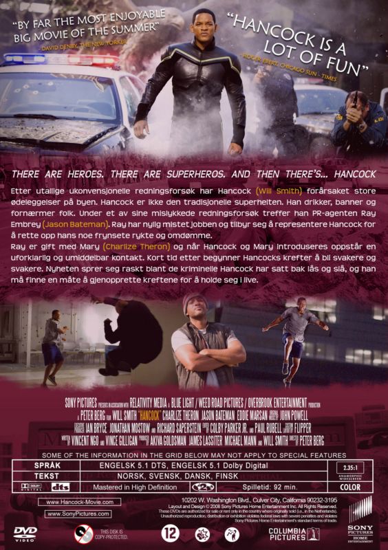 | Hancock is a modern day twist on the epic superhero movie. Hancock (Will Smith) is the anti-superhero, a drunk who ends up costing the city more money than doing it any good. Ray (Jason Bateman) is a PR guy looking to change the world but doesn't have the ability to. Hancock saves Ray's life and Ray decides to do the same for him. They start on a publicity stunt, putting Hancock in jail for his misdeeds eventually turning him into a superhero the city can be proud of. The twists and turns in this movie keep you in suspense, never knowing what's going to happen next. |
