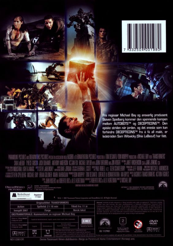 | "Transformers" (2007) is a motion picture about the heroic Autobots fighting the evil Decepticons to recover the Allspark, a device of great power, that was lost from their home planet Cybertron. They find that the Allspark has landed on the planet Earth, and they both go to recover it. Sam Witwhicky (Shia LaBeouf), upon buying his first car, learns that his car is actually the Autobot Bumblebee (Mark Ryan) masquerading as a common vehicle. Bumblebee becomes his guardian, but as more and more Decepticons begin to launch attacks on Earth, the other Autobots intervene in order to protect the location of the Allspark for the leader of the Decepticons, Megatron (Hugo Weaving). Sam Witwhicky and his girlfriend Mikaela Banes (Megan Fox) must help Optimus Prime (Peter Cullen) and the Autobots save Earth from the tyranny of Megatron. |
